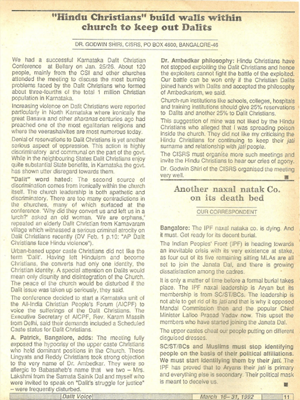 Urban-based upper caste Christians did not like the term ‘Dalit’. Having left Hinduism and become Christians, the converts had only one identity, the Christian identity. A special attention on Dalits would mean only disunity and disintegration of the Church. The peace of the church would be disturbed if the Dalit issue was taken up seriously, they said.