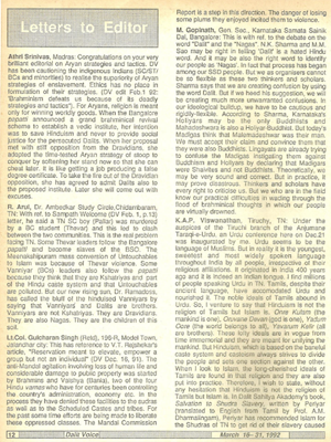 Lt. Col. Gulcharan Singh (Retd), 196-R, Model Town, Jalandhar city: This has reference to V.T. Rajshekar’s article, “Reservation meant to elevate, empower a group but not an individual” (DV Dec. 16, 91). The anti-Mandal agitation involving loss of human life and considerable damage to public property was started by Brahmins and Vaishya (Bania), two of the four Hindu varnas who have for centuries been controlling the country’s administration, economy etc. In the process they have denied these facilities to the sudras as well as to the Scheduled Castes and tribes. For the past some time efforts are being made to liberate these oppressed classes. The Mandal Commission Report is a step in this direction. The danger of losing some plums they enjoyed incited them to violence.