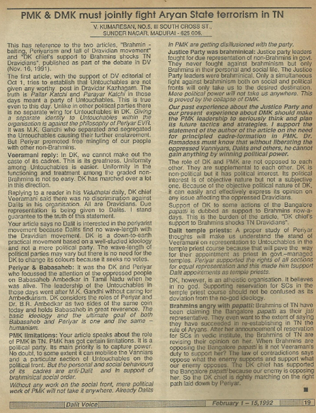 PMK limitations: Your article speaks about the role of PMK in TN. PMK has got certain limitations. It is a political party. Its main priority is to capture power. No doubt, to some extent it can mobilise the Vanniars and a particular section of Untouchables on the political front. But the personal and social behaviours of its cadres are anti-Dalit and in support of brahminical social order.