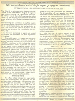 This letter is in reference to the front-page article, “Revolt by the Untouchables Augurs Changes in India” that appeared in the Washington Post (Nov. 30, 1991). I wish to thank its foreign service editor, Steve Coll, for bringing to the American public the untold sufferings of the Dalits (the Untouchables) of India.